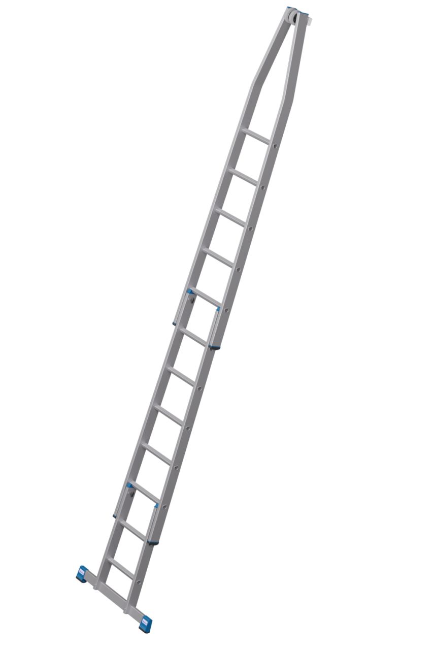 • A létra felső tagja fali vezetőgörgőkkel és kopásálló, puha gumi anyagú érintkező blokkal, ékkivágással, mely házsarkokra és ablakprofilokra helyezhető.